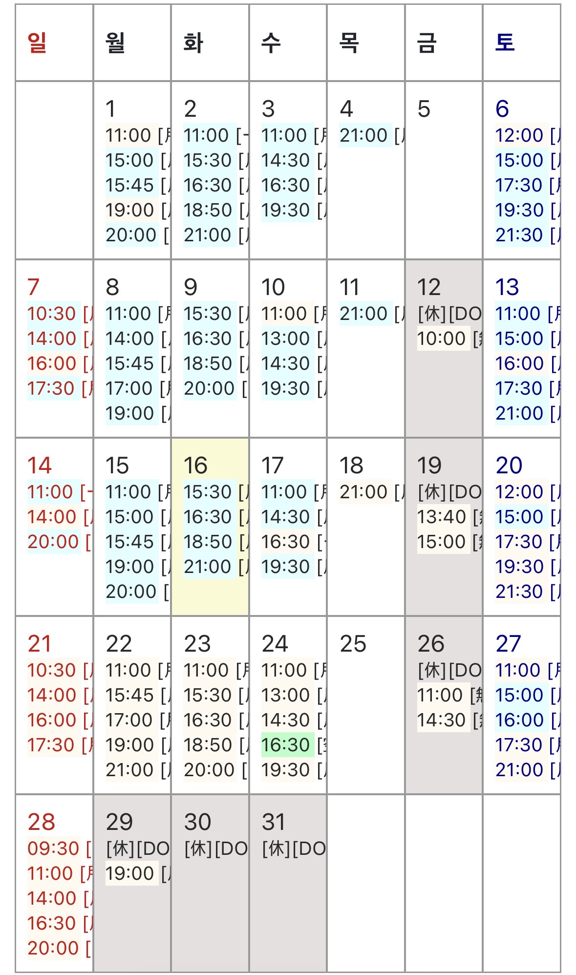 - レッスン日→振替希望日(緑色、ピンク色のお時間)