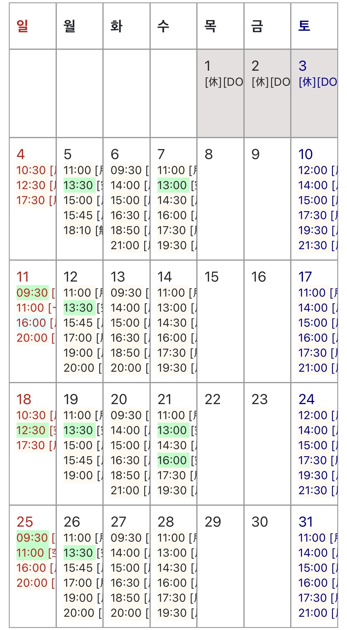 振替したい月から2ヶ月間の間の、緑の空き時間のみ振替可能。予定が合わない場合は自動消化となります。