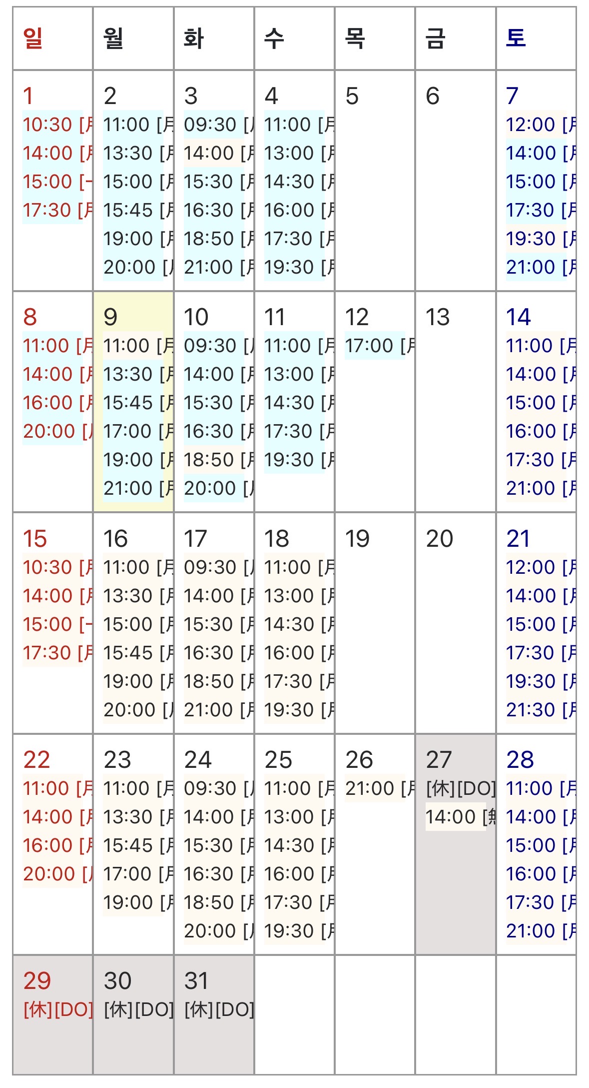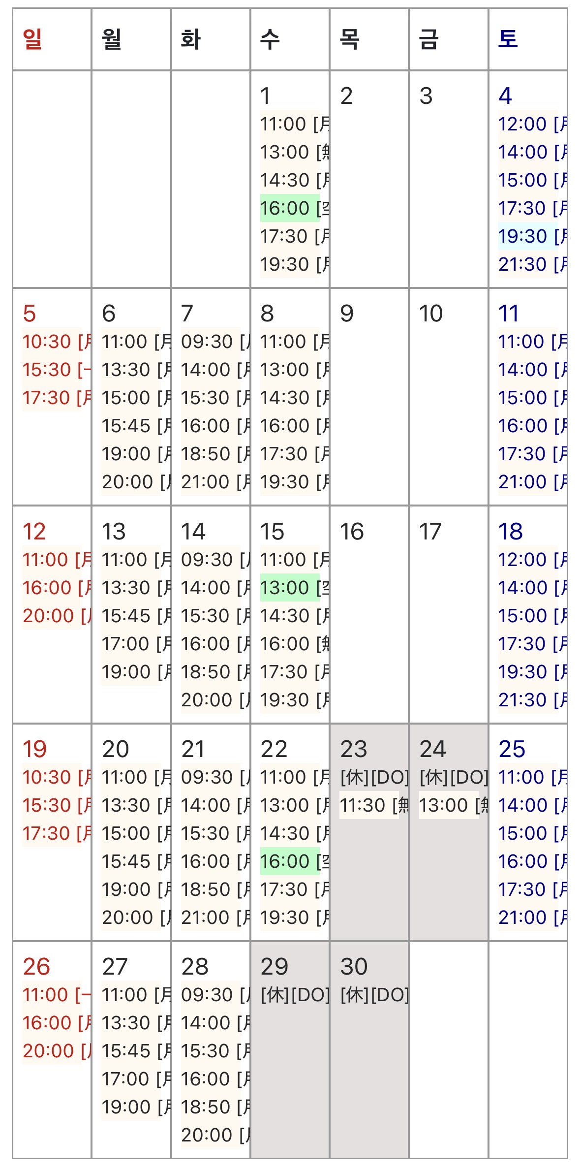 グレーで塗り潰した日はご予約不可。