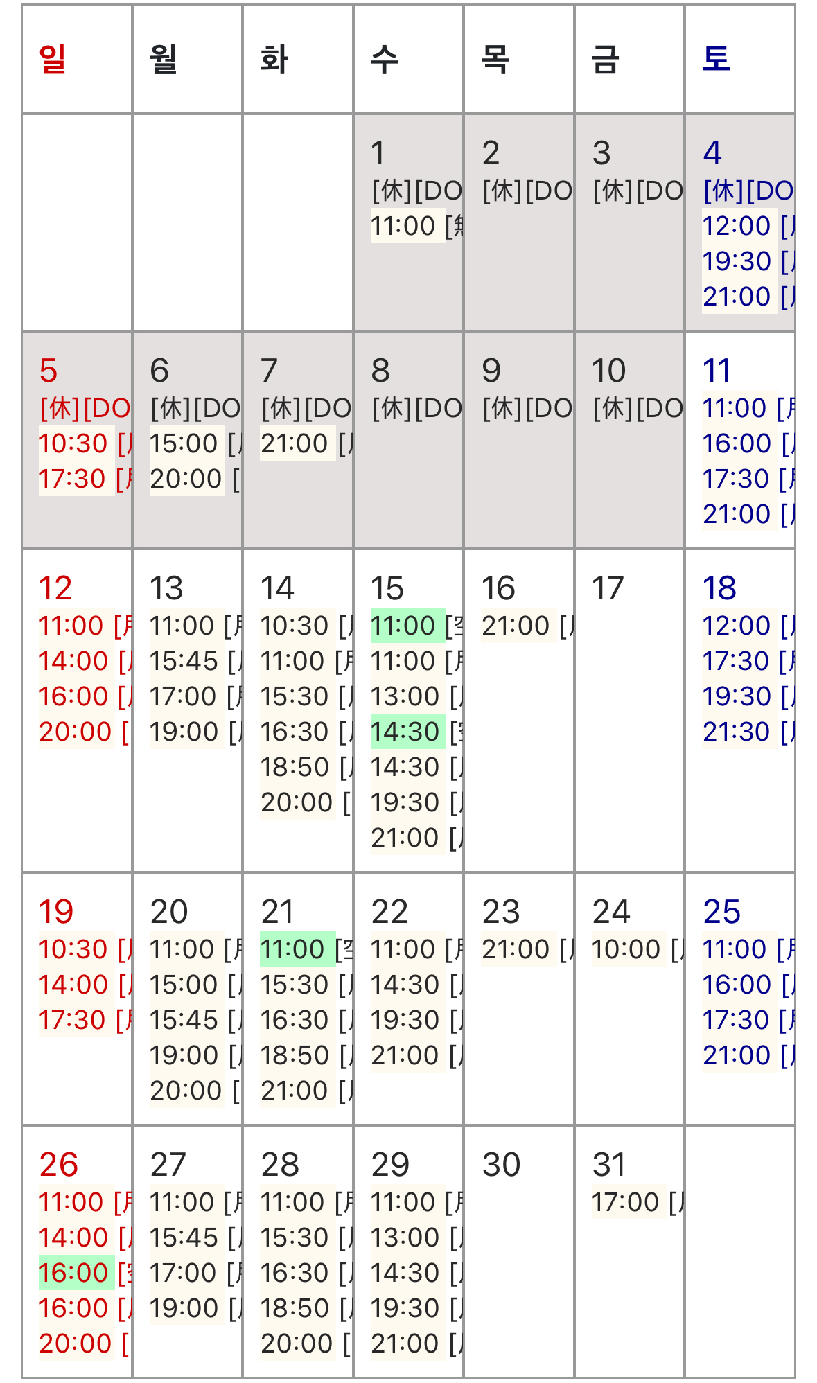 グレーで塗り潰した日はご予約不可。
