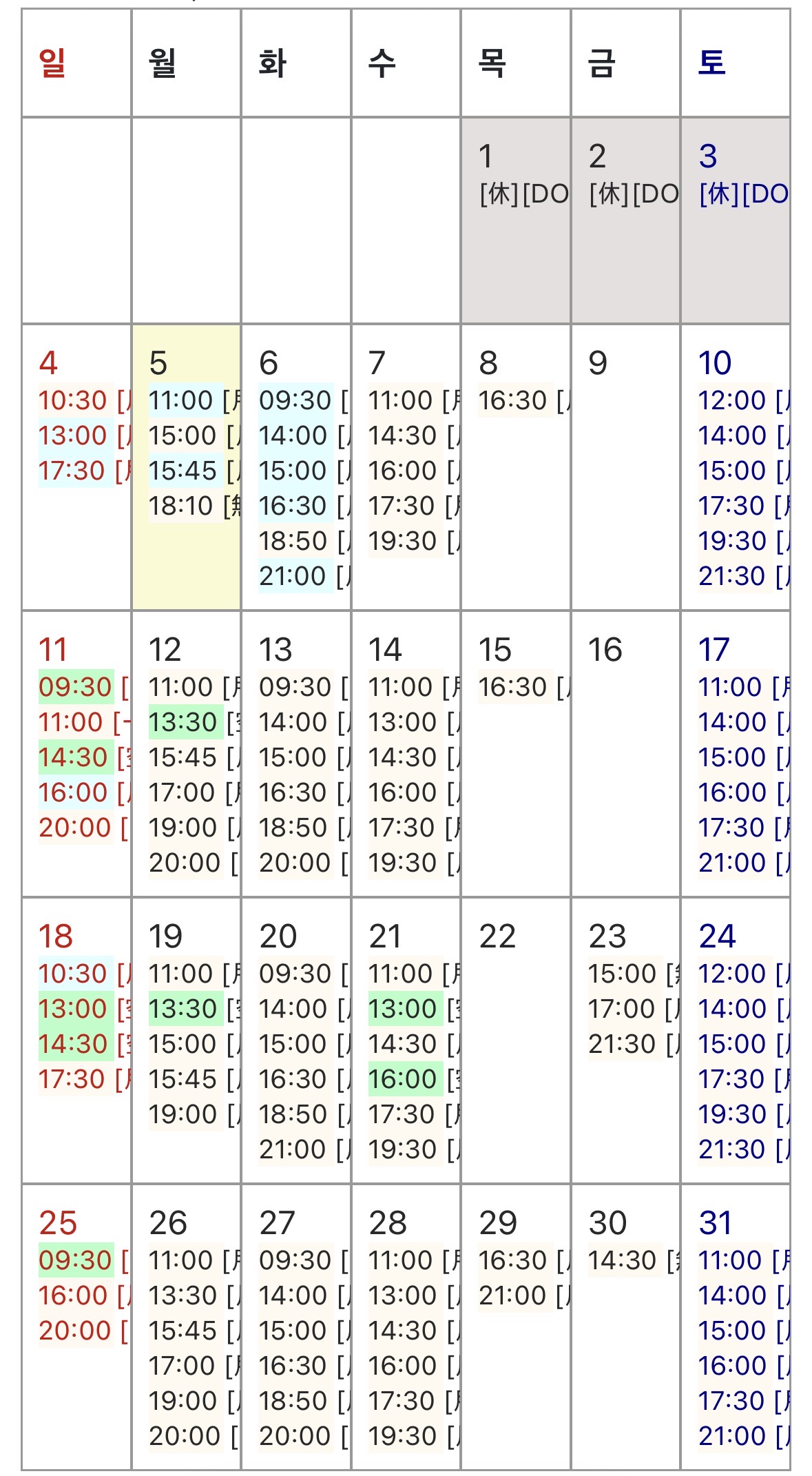• レッスン日→振替希望日(緑色、ピンク色のお時間